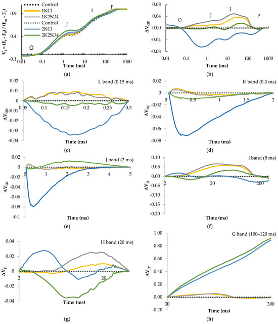 Expression of Cannabis plant response to KCl and K2SO4 soil fertilization in two growing stages (1—flowering; 2—ripening stage) are presented as kinetics of relative variable fluorescence Vt and as difference kinetics ΔVOP (a,b). Difference kinetics ΔVt, for individual bands, L (c), K (d), J (e), I (f), H (g), and G (h) are plotted at different time ranges. Each curve represents the average of ten measurements (n = 10) per treatment and growth stage. The control values (treatment without fertilization) per growth stage were used as referent values. The O, J, I, and P steps are indicated in Vt and ΔVOP curves.