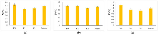 The macronutrient content (N, P, and K) in different industrial hemp stem samples (K0—control, K1—KCl, K2—K2SO4) (a) N (%), (b) P(%) and (c) K (%). Vertical error bars indicate a standard error of 5%.