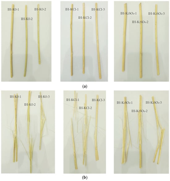 After the two different K fertilization treatments (KCl and K2SO4), samples of the dry industrial hemp stems were subjected to tensile tests. The results were compared with samples that had not been fertilized (K0). Each group consists of three test samples (Figure 6a). The relationship between stresses and strains are shown in Figure 6. Figure 6b shows samples of the industrial hemp after tensile failure.