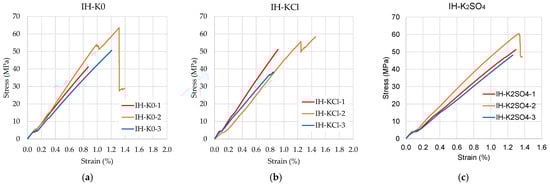 The modulus of elasticity was determined based on linear regression lines placed on the elastic part of the stress–strain curve (Figure 7). The average modulus of elasticity equals 4.99 GPa for IH-K0, 5.06 GPa for IH-KCl, and 5.07 GPa for IH-K2SO4. The highest modulus of elasticity was obtained for sample IH-KCl-1 and was 6.51 GPa, while the lowest value of 3.37 GPa was obtained for sample IH-KCl-2.