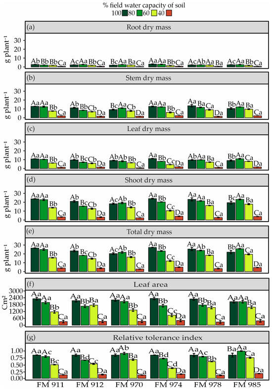 Dry mass of roots (a), stem (b), leaves (c), shoot (d), total dry mass (e), leaf area (f), and drought tolerance (g) of cotton cultivars (FM 911 GLTP, FM 912 GLTP RM, FM 970 GLTP RM, FM 974 GL, FM 978 GLTP RM, and FM 985 GLTP) grown under different water regimes (100, 80, 60, and 40% of field capacity—FC). The columns represent the mean of four repetitions ± standard error (Mean ± SE). Uppercase letters compare water regimes within the same cotton genotype. Lowercase letters compare cotton genotypes within the same water regime. Different uppercase and lowercase letters indicate a significant difference according to the Scott–Knot test (p ≤ 0.05).
