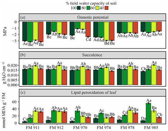 Osmotic potential (a), leaf succulence (b), and lipid peroxidation (c) of cotton cultivars (FM 911 GLTP, FM 912 GLTP RM, FM 970 GLTP RM, FM 974 GL, FM 978 GLTP RM, and FM 985 GLTP) under different water regimes (100, 80, 60, and 40% FC). The columns represent the mean of four repetitions ± standard error (Mean ± SE). Uppercase letters compare water regimes within the same cotton genotype. Lowercase letters compare cotton genotypes within the same water regime. Different uppercase and lowercase letters indicate a significant difference according to the Scott–Knot test (p ≤ 0.05).