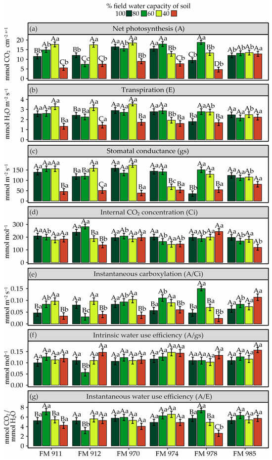 Net photosynthesis (A, a), transpiration (E, b), stomatal conductance (gs, c), internal CO2 concentration (Ci, d), Rubisco carboxylation efficiency (A/Ci, e), intrinsic water use efficiency (A/gs, f), and instantaneous water use efficiency (A/E, g) of cotton cultivars (FM 911 GLTP, FM 912 GLTP RM, FM 970 GLTP RM, FM 974 GL, FM 978 GLTP RM, and FM 985 GLTP) under different water regimes (100, 80, 60, and 40% FC). The columns represent the mean of four repetitions ± standard error (Mean ± SE). Uppercase letters compare water regimes within the same cotton genotype. Lowercase letters compare cotton genotypes within the same water regime. Different uppercase and lowercase letters indicate a significant difference according to the Scott–Knot test (p ≤ 0.05).