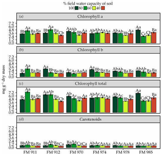 Chlorophyll a (Chl a, a), chlorophyll b (Chl b, b), chlorophyll total (Chl total, c), and carotenoids (d) levels of cotton cultivars (FM 911 GLTP, FM 912 GLTP RM, FM 970 GLTP RM, FM 974 GL, FM 978 GLTP RM, and FM 985 GLTP) under different water regimes (100, 80, 60, and 40% field capacity—FC). The columns represent the mean of four repetitions ± standard error (Mean ± SE). Uppercase letters compare water regimes within the same cotton genotype. Lowercase letters compare cotton genotypes within the same water regime. Different uppercase and lowercase letters indicate a significant difference according to the Scott–Knot test (p ≤ 0.05).