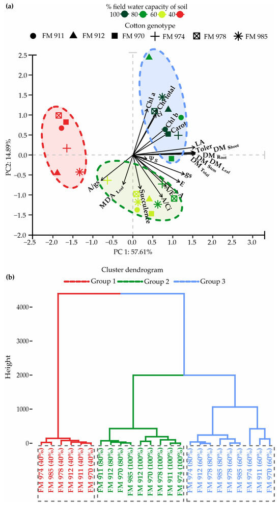 Principal Component Analysis (a) and cluster (b) for biomass and physiological attributes—total dry mass (DMTotal), stem dry mass (DMStem), leaf dry mass (DMLeaf), root dry mass (DMRoot), shoot dry mass (DMShoot), leaf area (LA), relative stress tolerance (Toler), lipid peroxidation (MDALeaf), leaf succulence (succulence), osmotic potential (Ψs), chlorophyll a (Chl a), chlorophyll b (Chl b), total chlorophyll (Chl total), carotenoids (Carot), internal CO2 concentration (Ci), intrinsic water use efficiency (A/gs), Rubisco carboxylation efficiency (A/Ci), instantaneous water use efficiency (A/E), net photosynthesis (A), transpiration (E), and stomatal conductance (gs).