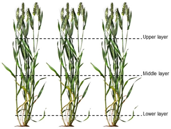 During the wheat grain-filling period, an LP-80 (ACCUPAR LP-80; Decagon, Quincy, CA, USA) instrument was used to measure the leaf area index at different layers. The measurement was conducted horizontally at the center of the wheat population. Vertical measurements were taken of the upper layer (flag leaf layer), middle layer (the second leaf layer from the top), and lower layer (5 cm above the ground) of the wheat separately, as shown in Figure 2. Our design of this multi-dimensional measurement approach provides detailed data on the leaf area distribution, which is closely related to photosynthetic efficiency and overall crop productivity.