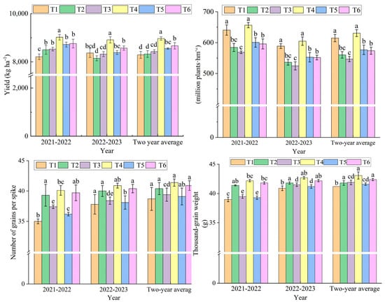 The effect of delayed nitrogen fertilizer application and planting density on the yield components of uniformly sown winter wheat. Note: Six treatments were designed as follows: for T1, T2, and T3, the nitrogen application ratio was 6:4:0, corresponding to planting densities of 3.3 million, 2.36 million, and 1.77 million plants·hm−2, respectively; for T4, T5, and T6. Different letters indicate significant difference at p = 0.05 level.