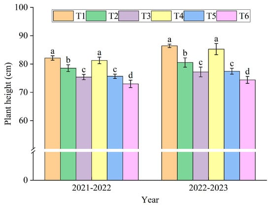 The effect of delayed nitrogen fertilizer application and planting density on the plant height of uniformly sown winter wheat. Note: Six treatments were designed as follows: for T1, T2, and T3, the nitrogen application ratio was 6:4:0, corresponding to planting densities of 3.3 million, 2.36 million, and 1.77 million plants·hm−2, respectively; for T4, T5, and T6. Different letters indicate significant difference at p = 0.05 level.