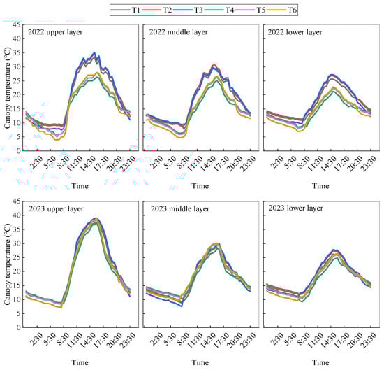The canopy temperature is of crucial significance for the grain-filling process of uniformly sown winter wheat. Nitrogen fertilization strategies and planting density exert a highly significant impact on the canopy temperature of uniformly sown winter wheat, as depicted in Figure 5 and Figure 6. The results obtained from the two-year experimental trials illustrate that the diurnal variation in the canopy temperature manifests a distinct and regular pattern. During the period from 0:00 to 8:00, the canopy temperature undergoes a continuous downward trend. Commencing at 8:00 a.m., it initiates a progressive upward shift. This phenomenon can be attributed to the fact that, as the sun rises, the light intensity escalates, thereby triggering the wheat canopy to commence the absorption of solar radiant heat. At approximately 16:00–17:00, the canopy temperature attains its peak value within the daily cycle. Thereafter, with the diminishing intensity of solar radiation, the canopy temperature embarks on a gradual decline. In the vertical profile, the canopy temperature of uniformly sown winter wheat follows a hierarchical sequence of the upper layer > middle layer > lower layer. A decrease in the planting density is concomitant with an elevation in the canopy temperature at each layer. When the planting density remains invariant, the postponement of nitrogen fertilization gives rise to a reduction in the canopy temperature across all layers, with the T4 (the ratio of base fertilizer, jointing fertilizer, and booting fertilizer is 4:3:3, with a planting density of 3.3 million plants per hectare) treatment exhibiting the lowest temperature value.