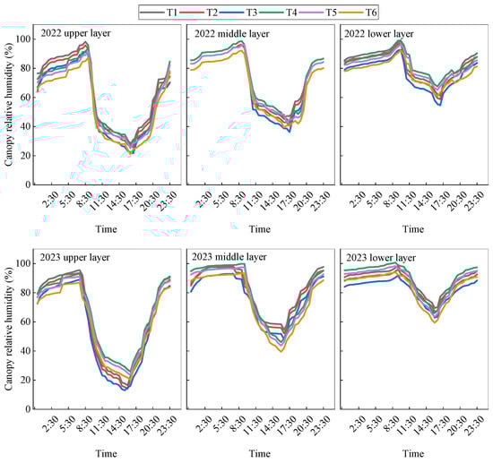 The strategies for nitrogen fertilizer application and planting density exert a significant influence on the canopy relative humidity of uniformly sown winter wheat, as depicted in Figure 6. Temporal variations in the relative humidity across each canopy layer follow a distinct “ascending–descending–ascending” pattern. Relative humidity steadily rises from midnight (0:00) onwards, reaching its diurnal maximum at 8:00 a.m. Subsequently, as the ambient temperature ascends, it undergoes a progressive decline, bottoming out between 4:00 p.m. and 5:00 p.m. During daylight hours, the canopy relative humidity adheres to the sequence of lower layer > middle layer > upper layer. Conversely, during the night, the vertical distribution of the canopy relative humidity is reconfigured, following the order of middle layer > lower layer > upper layer. The findings from the two-year experimental study reveal that a reduction in planting density corresponds to a decrease in the relative humidity at each canopy layer. When the planting density is held constant, postponed nitrogen fertilization serves to elevate the relative humidity at each layer, with the T4 (the ratio of base fertilizer, jointing fertilizer, and booting fertilizer is 4:3:3, with a planting density of 3.3 million plants per hectare) treatment exhibiting a comparatively high relative humidity value.