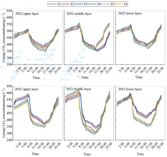 Both the planting density and the practice of postponed nitrogen fertilization exert a pronounced influence on the canopy CO2 concentration of uniformly sown winter wheat (illustrated in Figure 7). The canopy CO2 concentration experiences a steady yet relatively moderate upward climb from 0:00 to 8:00, attaining its peak value precisely at 8:00. Subsequently, it dips to its lowest concentration between 16:00 and 18:00. The findings from the two-year experimental trials reveal that, during the period from 8:30 to 17:30, a reduction in the planting density is concomitant with a decline in the CO2 concentration across each canopy layer. When the planting density is held constant, the implementation of postponed nitrogen fertilization leads to a decrease in the CO2 concentration at each layer, with the T4 (the ratio of base fertilizer, jointing fertilizer, and booting fertilizer is 4:3:3, with a planting density of 3.3 million plants per hectare) treatment registering the lowest CO2 concentration. In addition, in the vertical aspect, the magnitude of the carbon dioxide concentration in the canopy is shown as the lower layer > the upper layer > the middle layer.