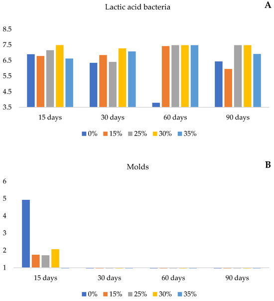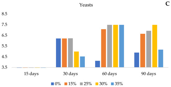 Microbial populations (log CFU/g fresh silage) ((A) Lactic acid bacteria; (B) Molds; (C) Yeasts) of total mixed rations based on cactus pear and relocated sorghum silage (0, 15, 25, 30, and 35%) on different opening days (15, 30, 60, and 90 days).