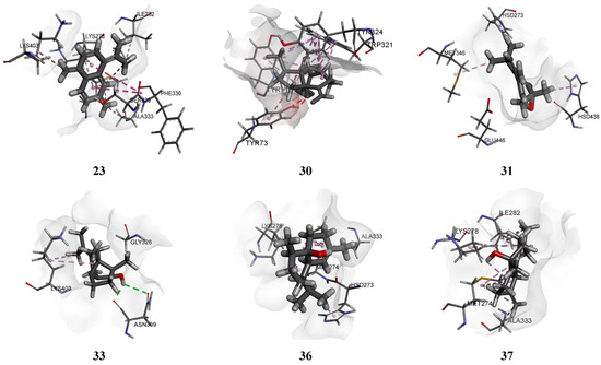 Depictions of 3D interactions between the major compounds and Dm-AChE: γ-cadinene (23), spathulenol (30), caryophyllene oxide (31), copaborneol (33), di-epi-1,10-cubenol (36), τ-muurolol (37), τ-cadinol (38), and α-cadinol (40).