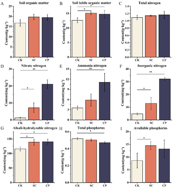 Soil carbon, nitrogen, and phosphorus under different legume intercropping systems. (A) Soil organic matter. (B) Soil labile organic matter. (C) Total nitrogen. (D) Soil nitrate nitrogen. (E) Ammonia nitrogen. (F) Inorganic nitrogen. (G) Alkali-hydrolyzable nitrogen. (H) Total phosphorus. (I) Available phosphorus. “*” means significant difference (p < 0.05); “**” indicates extremely significant difference (p < 0.01).