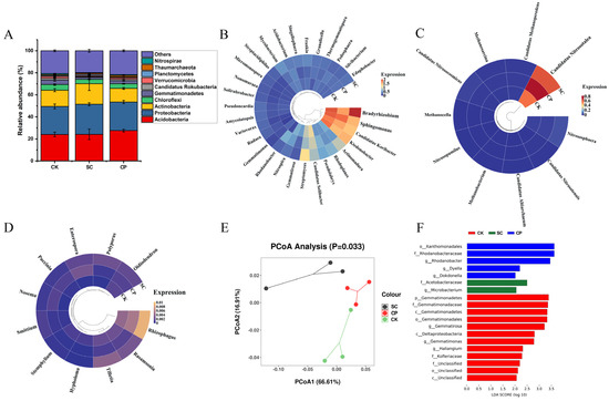 In Figure 2E, PCoA analysis at the phylum level was performed on the microorganisms of all samples. The distance between CK and CP was smaller than that between CK and SC, and the structural difference of microorganisms was mainly separated along the PCoA2 axis. Combined with the microorganism composition of all samples at the phylum level (in Figure 2A), Actinobacteria, Rhodoplanes, and Thaumarchaeota were obviously enhanced in SC, while Rhodanobacter, Pseudolabrys, and Pedosphaera were manifestly improved in CP compared to those in the monoculture. These results suggest that microorganism composition differences in soils between monocropping and intercropping systems and between intercropping different legume systems were distinct. According to the results of LEfSe analysis (in Figure 2F), at the genus level, the genera with LDA > 2 in the CP group were Rhodanobacter, Dyella, and Dokdonella; the genus with LDA > 2 in the SC group was Microbacterium; while the genera with LDA > 2 in the CK group were Gemmatirosa, Gemmatimonas, and Haliangium. Compared with CP and CK, only one species was displayed in SC. The LDA value of Rhodanobacter was shown to be more significant in CP than in the other two treatments.