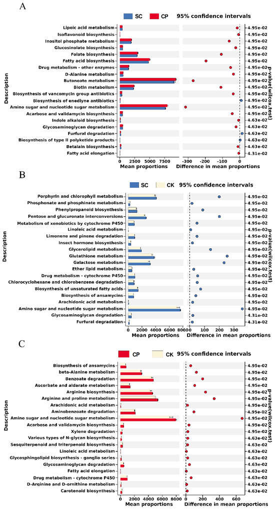 The effect of legume intercropping on microbial metabolic pathways. (A) The significant differential metabolic pathways between SC and CP groups. (B) The significant differential metabolic pathways between SC and CK groups. (C) The significant differential metabolic pathways between CP and CK groups.