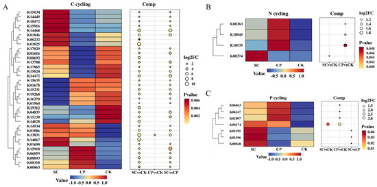Heat map and bubble map of the CNP cycling genes with significant differential expressions. (A) The C cycling genes with significant differential expressions. (B) The N cycling genes with significant differential expressions. (C) The P cycling genes with significant differential expressions.