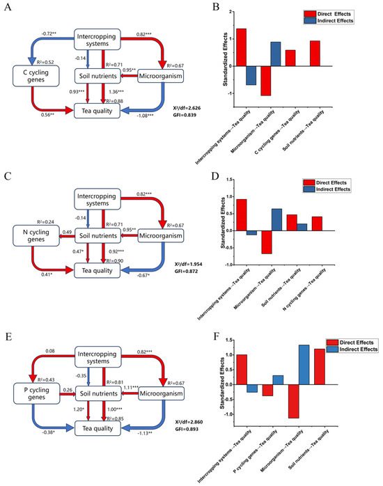 PLS-PM reveals the relationships among soil nutrition, CNP cycling genes, microbial relative abundance, and tea qualities under intercropping systems. R2 indicates the coefficients of determination. The path coefficients near the arrows indicate the direct effects of one variable on another variable. The red arrows in (A,C,E) indicate positive effects, and the blue ones indicate negative effects. The “*” indicates that the effects are significant (*, p < 0.05; **, p < 0.01 and ***, p < 0.001). The GFI index indicates the overall prediction performance. The red bars in (B,D,F) indicate direct effects, and the blue ones indicate indirect effects.
