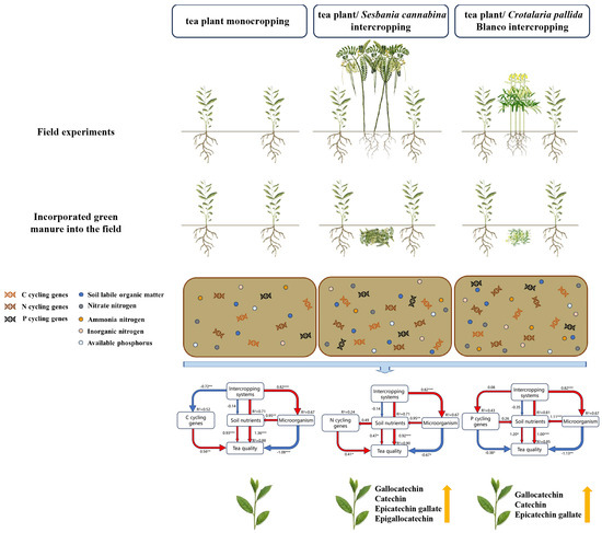 In summary, the intercropped legumes that were incorporated into the soil were effective in reducing chemical fertilizer and enhancing soil nutrients and tea qualities. Tea plantation intercropping legumes improved the abundance of C and N cycling-related functional microorganisms and genes mediated by changing the structure of microbial communities, further enhanced the environmental nutrients, and promoted the tea quality. However, the microorganism composition differences in soils between intercropping different legume systems were distinct. Our results showed that intercropping Sesbania cannabina improved the relative abundance of nitrogen-fixing microorganisms and promoted carbohydrate metabolism, carbon fixation, and methane metabolism compared to intercropping Crotalaria pallida Blanco. Thus, we recommend selecting Sesbania cannabina as the intercropping plant for future promotion. Meanwhile, considering these results, different species of legumes need to be further analyzed. As an ecological planting pattern, the intercropping of legumes can be used more extensively in tea plantation management in the future. Notably, further investigation is warranted into the seasonal dynamics of nutrient assimilation in tea plants and associated microbial activity, alongside the long-term implications of reduced chemical fertilizer application on sustainability and multi-annual yield performance. Future research will focus on these aspects to advance a more holistic understanding of the underlying mechanisms and outcomes. This study enhances our understanding of the relationship between soil nutrients, function genes of microorganisms, and tea quality in the intercropping of tea plants and different species of legumes and provides a better theoretical reference for the cultivation and management of tea plantations.