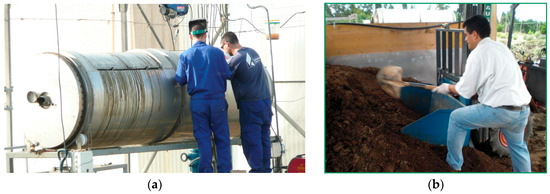 A self-produced compost and two commercial composts were used. C1 was made with plant remains from tomato (60%), melon (20%), and watermelon (20%) crops raised in greenhouses at the Cajamar Experimental Station. The starting plant remains had an approximate weight of 200 kg and a volumetric composition of 92%, to which 5% sawdust from tree pruning remains was added to stabilise the C/N ratio. 3% of zeolite was also added before the composting process to facilitate the mix with the organic phase during the thermophilic phase and to reduce the loss of ammonium by volatilisation. Zeolite was extracted from a quarry of the same province, and mineralogically, it was mainly composed of mordenite (82.5%) and smectite (7.5%). The physicochemical characteristics measured were pH = 8.72, EC = 2.23 dS m−1, bulk density 948.00 Mg m3, CEC = 157.5 cmol(+) Kg−1 and granularity < 1 mm. The composting process had several stages. The first step (thermophilic phase), which lasted between one and two weeks and had temperature peaks between 55 °C and 70 °C, was carried out in a 2.3 m3 rotating drum composting digester. The researchers made the digester themselves, and it allowed a maximum of 187 rotations/hour (Figure 1a). In this phase, it was key to rotate the material, expose it to fresh air, add oxygen, and release heat and gaseous decomposition products, for which a 430 m3/h S&P extractor fan with adjustable flow rate was coupled to the digester. After the thermophilic phase, the material was stored for three months in piles, where the maturation and stabilisation of the product occurred. During this period, manual aeration and humidification were carried out monthly to maintain optimal oxygen and humidity content (Figure 1b).