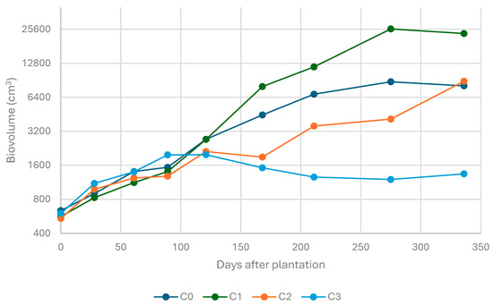 After 150 days, different trends were observed. C3 showed the lower plant performance. This could be explained by the fact that it had the lowest phosphorus content (Table 1). Phosphorus is an essential macronutrient for root growth, and its deficiency can diminish plant development [69]. C1 showed the best plant performance, which was expected from the previous section’s results. Our previous hypothesis that C2 could contain plant-growth-inhibiting substances could be reinforced with the plant performance results because individuals showed a lower growth with C1 and even compared with control soil C0. Only at the end of the experiment, close to one year after plantation, did the biovolume of the plants treated with C2 surpassed that of the plants growing on non-amended substrate C0.