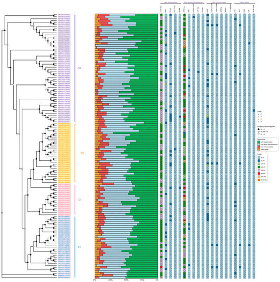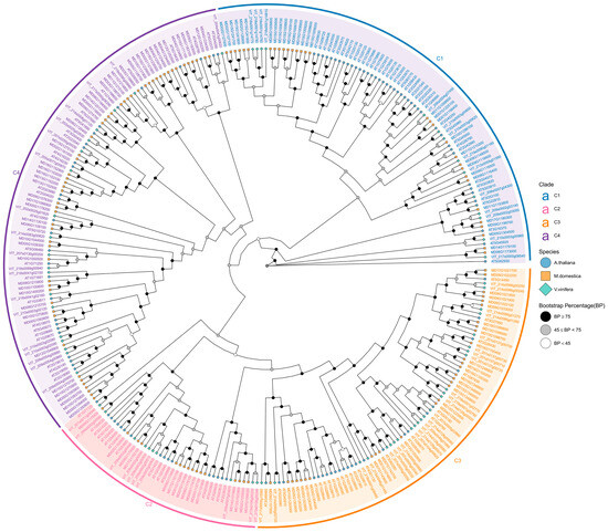 The evolutionary examination of the 347 GDSL protein sequences identified from M. domestica, V. vinifera and A. thaliana were conducted. These 347 GDSL proteins were categorized into four distinct subgroups, labeled C1, C2, C3, and C4. The evolutionary phylogeny was analyzed utilizing IQ-TREE software (2.0.3), employing the maximum likelihood (ML) method with bootstrap values derived from 1000 replicates. The phylogenetic tree was visualized through the use of the R package ggtree (3.10.0).