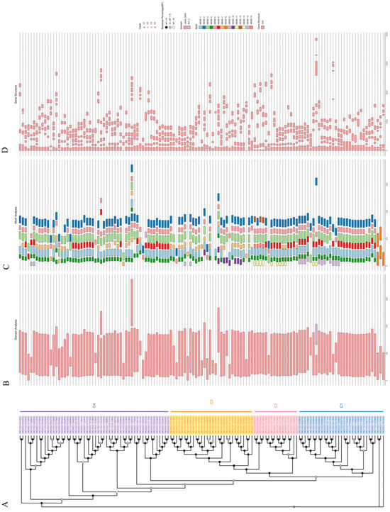 Analysis of phylogenetic relationships, conserved domains, motifs, and gene structures related to GDSL in M. domestica. (A) Phylogenetic tree depicting GDSL proteins from M. domestica. The evolutionary analysis was performed using IQ-TREE software (2.0.3) (method: maximum likelihood (ML); bootstrap values: 1000 iterations). (B) The conserved domains present in GDSL protein sequences found in M. domestica. (C) Distribution of conserved motifs across GDSL proteins in M. domestica, with 15 putative motifs represented in various colored boxes. (D) Gene structure associated with GDSL genes in M. domestica.