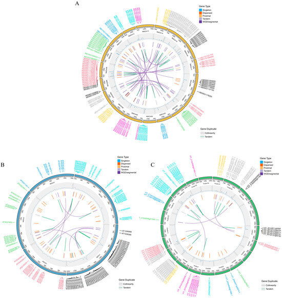 Analysis of gene duplication events for GDSL genes in M. domestica (A), A. theliana (B) and V. vinifera (C). The TD and WGD gene names are highlighted in green and purple, respectively.