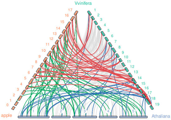 Analysis of synteny among M. domestica, V. vinifera and A. thaliana was conducted. The collinear blocks associated with M. domestica, V. vinifera and A. thaliana are represented by red, green and blue lines, respectively.