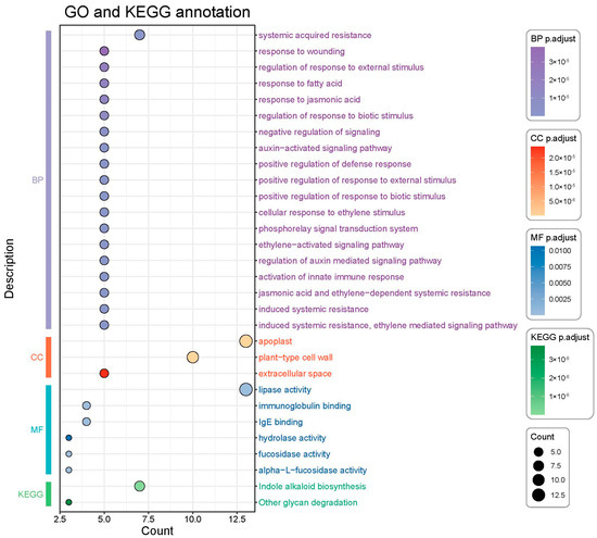 Functional annotations of GO and KEGG for GDSL genes in M. domestica were analyzed. The GO terms were categorized into three groups: biological process (BP), cellular components (CCs), and molecular function (MF). The vertical axis represents the annotated GO terms, while the horizontal axis displays the number of genes associated with these GO terms. BP, CC, and MF are represented by purple, red, and blue colors, respectively, whereas KEGG is indicated in green.