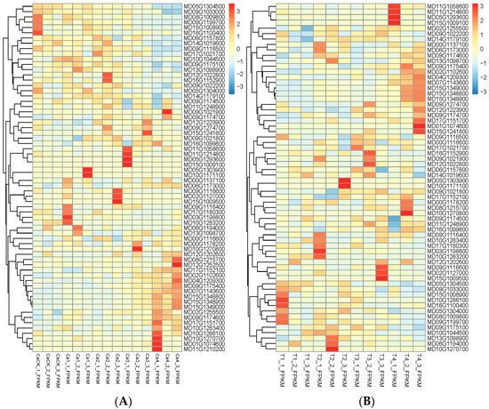 Previous studies have demonstrated that GDSL plays a crucial role in plant responses to abiotic stress (Ding et al., 2020; Aiello et al., 2020; Chiconato et al., 2021 [6,7,8]). In this study, we aimed to explore the potential biological function of the MdGDSL gene in response to abiotic stress by comprehensively analyzing the expression profile changes in the MdGDSL gene under high concentrations of CaCl2 and cold stress using RNA-seq data. Based on previous studies, we established a differential expression threshold (up-regulated greater than 1.5, down-regulated less than 0.5) to identify genes that respond to stress (Li et al., 2015) [38]. As shown in Figure 8, our analysis indicates that, under high concentrations of CaCl2 stress, the expression levels of Md10G1044500, Md13G1098900, Md12G1022800, Md16G1152900, Md09G1021900, Md09G1174700, Md15G1241800, Md11G1058600, Md11G1241800, Md05G1293600, Md15G1009100, Md05G1303900, Md10G1171100, Md09G1116600, Md02G1127000 and Md15G1009500 were significantly up-regulated (Figure 8). Additionally, we observed that the expression levels of certain MdGDSL genes decreased with prolonged exposure to high concentrations of CaCl2, while the expression levels of some MdGDSL genes increased over time. These findings suggest that MdGDSL gene expression is dynamically regulated in M. domestica subjected to high concentrations of CaCl2 over extended periods.