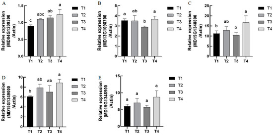 Expression patterns of MdGDSL genes under cold stress by RT-qPCR. (A–E) The expression level of MD04G1209300 (A), MD13G1098700 (B), MD15G1348800 (C), MD15G1349000 (D) and MD15G1348900 (E) genes under cold treatment. The expression levels were calculated using 2−ΔΔCt methods. Means ± SDs (n = 6). Different lowercase letters indicate significant differences among means (p < 0.01). qRT-PCR analysis were performed using the MdActin (MD07G1012400) as an internal control. (T1) flowers that were not subjected to low-temperature stress, (T2) flowers that experienced low-temperature stress treatment, (T3) flowers that experienced low-temperature stress treatment after water spraying, and (T4) flowers that were subjected to low-temperature stress treatment after spraying with 20 mmol/L calcium chloride.