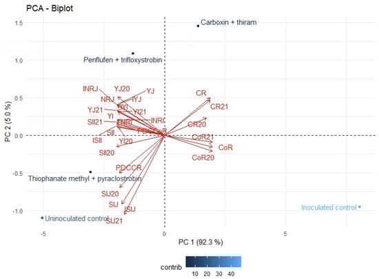 PCA for the effect of different seed treatment fungicides (gradient of blue) on the soybean crop’s disease severity and agro-economical parameters (Red). CR20: Charcoal rot PDI during 2020; CR21: Charcoal rot PDI during 2021; CR: Mean charcoal rot PDI; PDCCR: Percentage disease control charcoal rot; YI20: Yield at Indore during 2020; YI21: Yield at Indore during 2021; YI: Mean yield at Indore; IYI: Increased yield (%) at Indore; SII20: Seed index at Indore during 2020; SII21: Seed index at Indore during 2021; SII: Mean Seed index at Indore; ISII: Increased seed index at Indore; NRI: Net return at Indore; INRI: Increased net return at Indore; CoR20: Collar rot incidence at Jorhat during 2020; CoR21: Collar rot incidence at Jorhat during 2021; CoR: Mean collar rot incidence at Jorhat; PDCCoR: Percentage disease control collar rot; YJ20: Yield at Jorhat during 2020; YJ21: Yield at Jorhat during 2021; YJ: Mean yield at Jorhat; IYJ: Increased yield (%) at Jorhat; SIJ20: Seed index at Jorhat during 2020; SIJ21: Seed index at Jorhat during 2021; SIJ: Mean Seed index at Jorhat; ISII: Increased seed index at Jorhat; NRJ: Net return at Jorhat; INRJ: Increased net return at Jorhat. The red vectors with pointed arrows, originating from the center of the PCA plot, represent the direction and magnitude of disease severity and agro-economic parameters. The red lines without pointed arrows differentiate the vectors from one another.