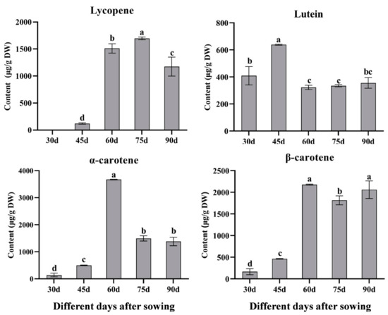 Carotenoid content in the taproots of red carrot at different developmental stages. Error bars show the standard error of the mean from three independent replicates, and distinct lowercase letters denote statistically significant differences at p < 0.05.