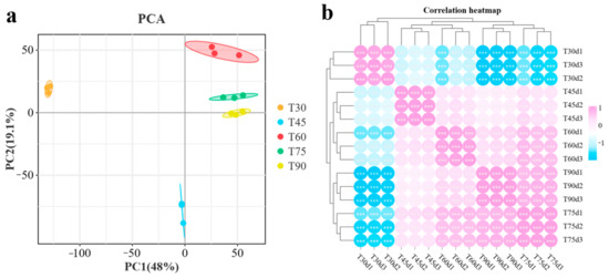 (a) Principal component analysis (PCA). The circles represent 95% confidence intervals; (b) Correlation analysis within the group heatmap, where purple indicates high correlation and blue indicates low correlation (*** indicates p ≤ 0.001).