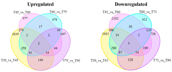 Analysis of RNA-seq data from taproot samples at five developmental stages of red carrots identified a total of 9177 DEGs. The peak number of DEGs occurred between 30 and 45 days, while the lowest count was observed between 60 and 75 days. In the comparison between T45 and T60, the number of down-regulated genes was significantly higher than that of up-regulated genes, suggesting a general suppression of transcriptional activity in the taproots during this period. Interestingly, two up-regulated and three down-regulated DEGs were identified across the five developmental stages (Figure 4).