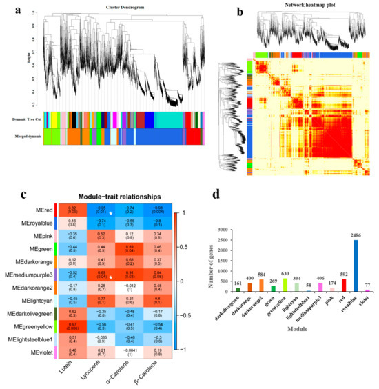 WGCNA based on DEGs from RNA-seq data; (a) Gene clustering tree and module cutting; (b) Cluster heatmap of DEGs in the modules. Each row and column in the heatmap correspond to a gene, with the color intensity (white, yellow, red) reflecting the stronger of the connectivity between the genes represented in the rows and columns; (c) Heatmap of the correlation between gene co-expression network modules and lycopene content. Red indicates a positive correlation, while blue indicates a negative correlation. An asterisk (☆) indicates significant modules; (d) Number of DEGs in each module.