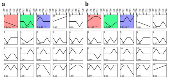 Trend analysis of DEGs in the red and mediumpurple3 modules; (a) Trend analysis of DEGs in the red module; (b) Trend analysis of DEGs in the mediumpurple3 module. Colored trend blocks represent significantly enriched trends (p < 0.05). The X-axes represent five different stages of taproot development. The Y-axes represent the changes in gene expression. The number in the upper left corner represents the module ID for trend analysis, and the number in the lower left corner represents the p-value of the trend module.