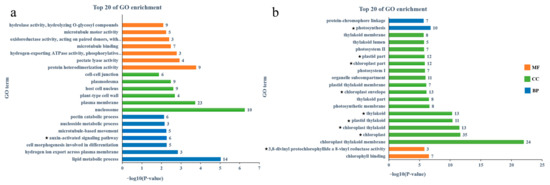 Top 20 GO enrichment items of DEGs in red and mediumpurple3 modules. The numbers displayed next to each GO term indicate the counts of genes from the input gene set that are associated with that specific GO category; (a) red module; (b) mediumpurple3 module. The five-pointed stars represent the GO items commented on in the figure.