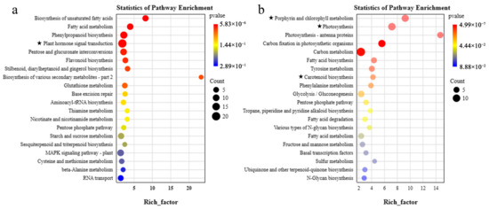 The KEGG analysis of DEGs in two modules demonstrated a significant enrichment of fatty acid metabolism and plant hormone signal transduction pathways in the red module, whereas the mediumpurple3 module showed a significant enrichment in pathways related to porphyrin and chlorophyll metabolism, photosynthesis, and carotenoid biosynthesis (Figure 8). We identified 20 genes related to hormone signaling, 25 genes involved in photosynthesis, 9 genes associated with chlorophyll metabolism, and 4 carotenoid pathway genes among the top 10 pathways. A total of 3 genes involved in hormone regulation, 17 genes related to photosynthesis, and 4 genes associated with chlorophyll metabolism were consistently found to be enriched in both GO and KEGG analyses in the two modules.