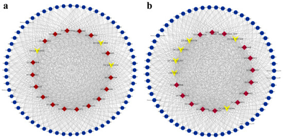 Gene co-expression networks and hub genes in red and mediumpurple3 modules; (a) red module; (b) mediumpurple3 module. The central 20 genes represent the top 20 hub genes with highest connectivity in the corresponding modules, and the genes highlighted in yellow are candidate genes associated with lycopene accumulation.