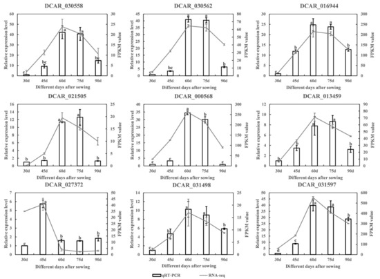 Three DEGs and six candidate genes were randomly chosen for validation through qRT-PCR analysis. The results were largely consistent with the gene expression levels obtained from RNA-seq (Figure 10), which supports the accuracy of the transcriptomic data. The qRT-PCR results revealed that the expression levels of the six identified candidate genes, DCAR_030558, DCAR_030562, DCAR_016944, DCAR_021505, DCAR_000568, and DCAR_013459, exhibited a pattern of initial increase followed by a subsequent decrease. The highest expression levels were recorded at 60 or 75 days, with no significant differences between the two time points except for DCAR_000568.