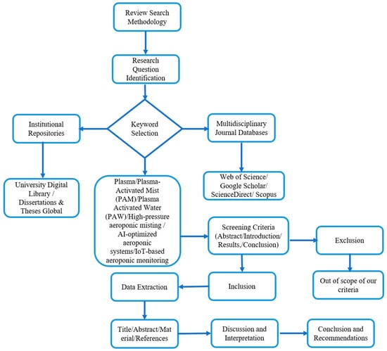 Additionally, the data used in this study came from previously published research articles. The combination of plasma, artificial intelligence, and Internet of Things applications in aeroponics has already been the subject of a great deal of scholarly research and material. Therefore, methodically effective approaches were taken into consideration in order to assess the advanced grasp of the topic area. The following keywords were chosen for the online search in order to find relevant literature: (‘High-pressure aeroponic misting’ OR ‘Low-pressure aeroponics’) AND (‘Plasma in aeroponics’ OR ‘Plasma-Activated Mist (PAM) in aeroponics’) AND (‘AI in aeroponic farming’ OR ‘AI-optimized aeroponic systems’) AND (‘IoT-based aeroponic monitoring’ OR ‘Smart aeroponic control systems’) AND (‘Plasma in soil’ OR ‘Plasma-Activated Water (PAW) in soil’) AND (‘Plasma in soilless cultivation’ OR ‘PAW in soilless systems’) AND (‘Sustainable aeroponic technologies’ OR ‘Advanced aeroponic farming’). Boolean operators (AND, OR) were utilized to guarantee the inclusion of relevant research while minimizing irrelevant outcomes.