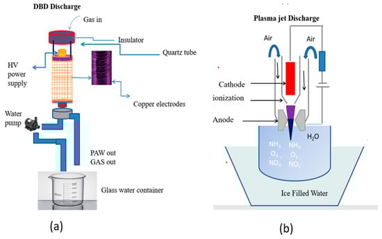 Schematic representation of PAW-generation models. (a) DBD discharge model; (b) jet spark model.