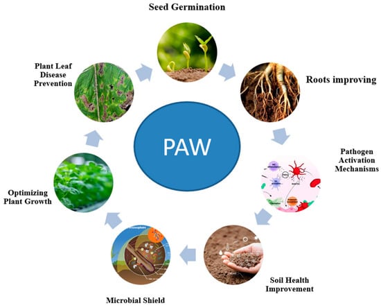 Furthermore, PAW facilitates nutrient absorption, thereby enhancing plant growth and improving root absorption efficiency, which results in increased biomass production [12,106,107,108]. The interaction of reactive oxygen and nitrogen species (RONS) with dissolved nutrients further enhances these effects, thereby contributing to overall plant performance.