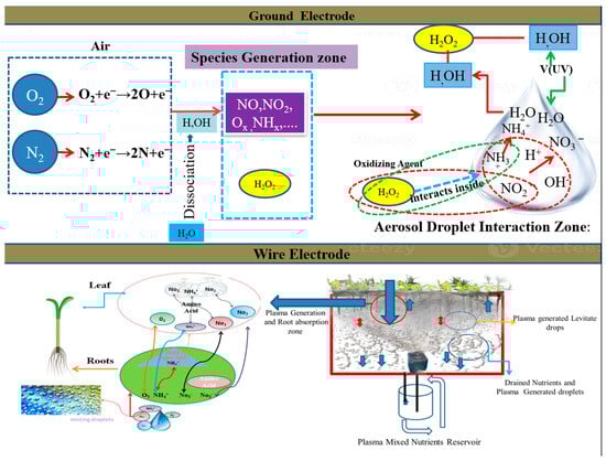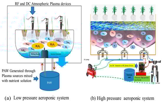 Plasma-activated mist droplets contain reactive oxygen species (ROS) and reactive nitrogen species (RNS) from air ionization during plasma discharge. In plasma devices such as DC and RF plasmas, the high-voltage discharge produces energetic particles that interact with ambient gases, resulting in the production of these reactive species. These species, particularly ROS and RNS, increase nutritional bioavailability by breaking down complex molecules, allowing plant cells to more easily absorb nutrients. This procedure can boost plant nutrient absorption efficiency and overall development in aeroponic systems. The ionization process creates highly charged ions and free electrons, which make plasma-activated mist more reactive and improve root uptake in aeroponic systems. System design optimization improves mist–plasma interactions, enabling effective exposure to reactive species [139,141,142,143]. Plasma-activated water (PAW) also improves mist droplets by raising the levels of nitrate (NO3−), nitrite (NO2−), ammonium (NH4+), and hydroxyl ions (OH−), which helps plants grow even more. However, additional research is required to refine these methods and assess their long-term effects on aeroponic systems [19]. When these reactive species are mixed with water, they make plasma-activated mist (PAM), which is spread out in the aeroponic chamber and comes into direct contact with plant roots to help them take in more nutrients and maybe fix problems with nitrogen fixation [14,144].