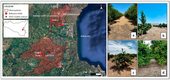 | Field 1 | Lentini (SR) | 37°20′12.65″ N, 14°53′33.04″ E | 47 | 1.0 | Tarocco Sciara on Carrizo citrange | 4 | 6 |
