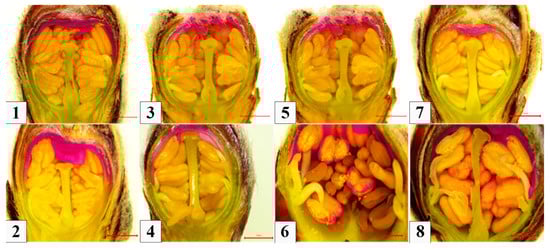 Prunus persica flower bud state in the control (1, 3, 5, 7) and after low-temperature influence (2, 4, 6, 8): 1, 2—“Temisovskij”; 3, 4—“Podarok Like”; 5, 6—“Loadel”; 7, 8—“Springold”. Bars are 1 mm.