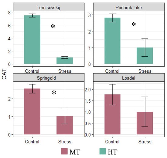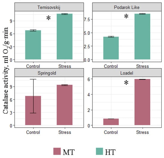 Catalase activity in peach flower buds at different stages of the experiment. MTs—medium-tolerant cultivars, HTs—highly tolerant cultivars. All data are expressed in the manner of means ± standard error of the mean (the number of replicates n = 9), and significant differences from the control are marked with p ≤ 0.05 (*). Data were analyzed by two-way ANOVA followed by a Bonferroni post hoc multiple comparison test.