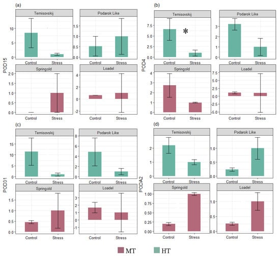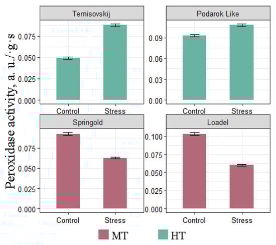 In contrast to MT cultivars, HT cultivars tended to increase in POD activity with a simultaneous decrease in the POD gene expressions. The expression of some peroxidase genes tended to increase (POD15, PODA2), and others tended to decrease (POD4, POD31) in “Podarok Like”. This variety is intermediate in resistance between “Sprigold”/”Loadel” and “Temissovskij”. On the other hand, peroxidase activity also increased in the highly resistant variety “Temisovskij” against a background of inhibition of the expression level of POD15, POD31, and POD4. The PODA2 gene also showed a tendency to decrease its expression level.
